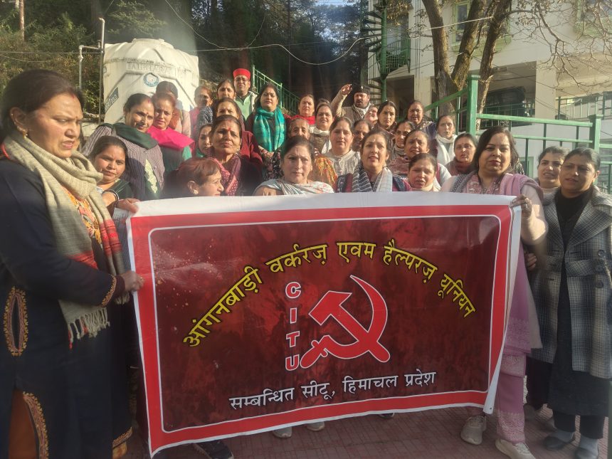 Shimla, 12 January-:आंगनवाड़ी वर्कर्स एवं हेल्पर्स यूनियन (सीटू) के बैनर तले आईसीडीएस प्रोजेक्ट शिमला के चक्कर, न्यू शिमला और संजौली वृत्तों की आंगनवाड़ी कर्मियों ने ड्यूटी के दौरान मृत आंगनवाड़ी कार्यकर्ता हर्षा को न्याय, मुआवज़ा तथा आंगनवाड़ी कर्मियों की सुरक्षा और विभागीय जवाबदेही सुनिश्चित करने की मांग को लेकर डीपीओ कार्यालय, निगम विहार शिमला के बाहर जोरदार प्रदर्शन किया।