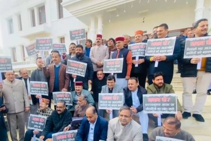 रोजगार के मुद्दे पर विधानसभा परिसर में बीजेपी विधायक दल का प्रदर्शन